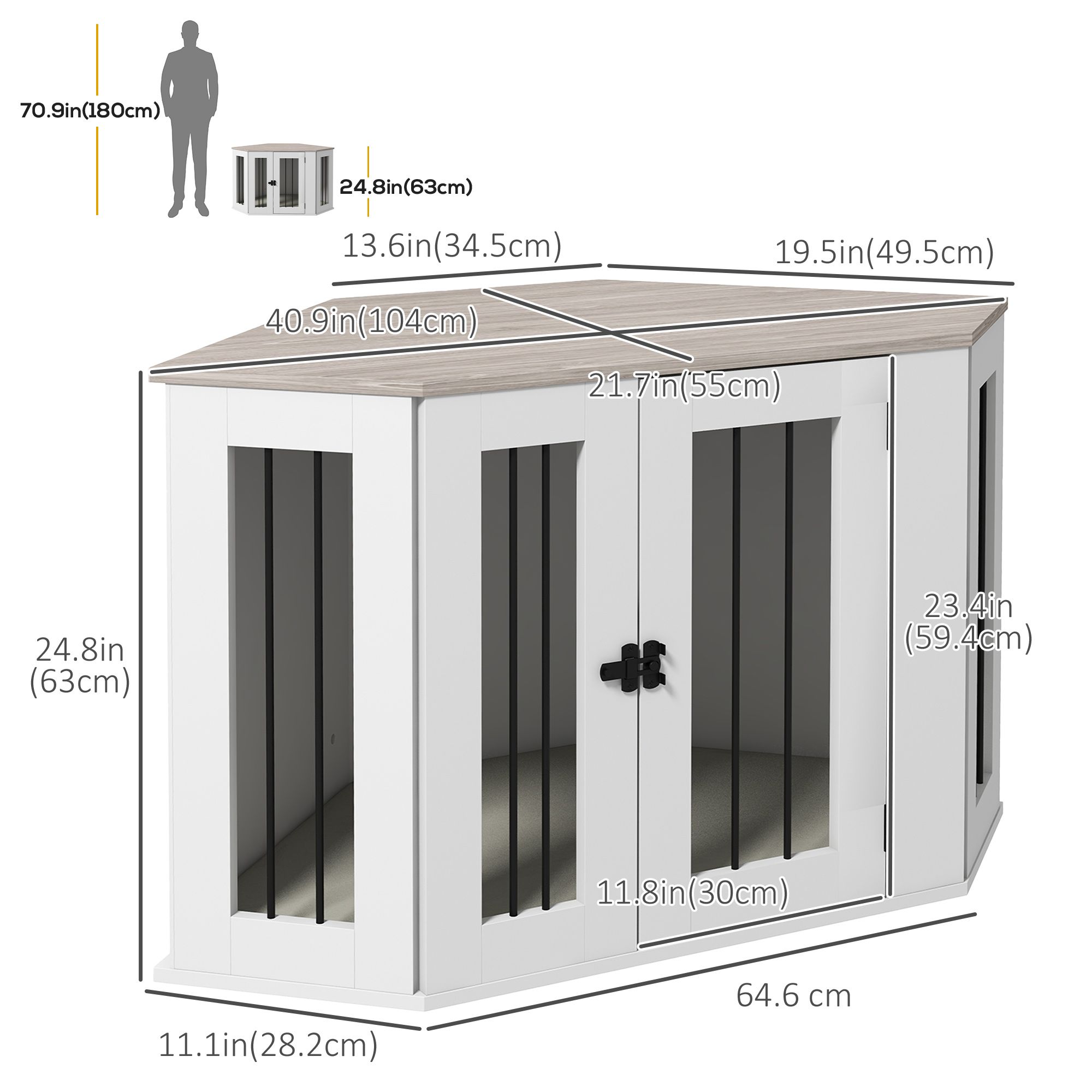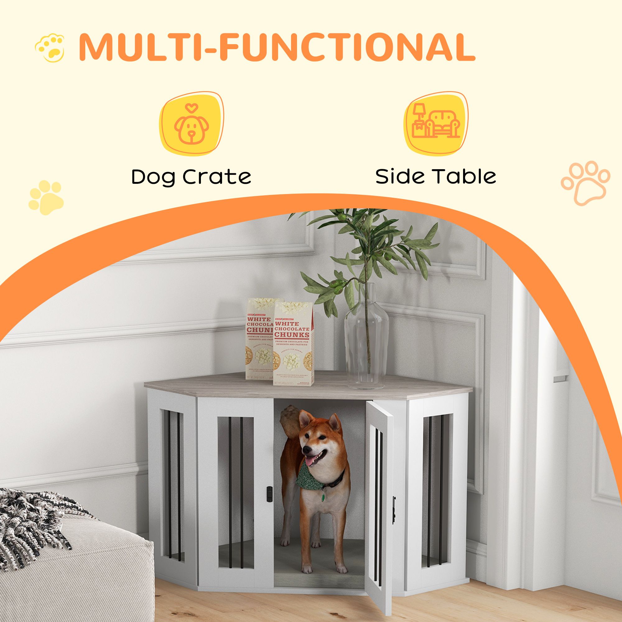 Enhance your space with this contemporary PawHut dog crate furniture, featuring modern design and natural wood grains. Its corner-friendly shape fits neatly against walls or furniture. The spacious door provides easy access, and the washable cushion ensures cleanliness. Enjoy lasting durability and strength, designed to withstand daily use.